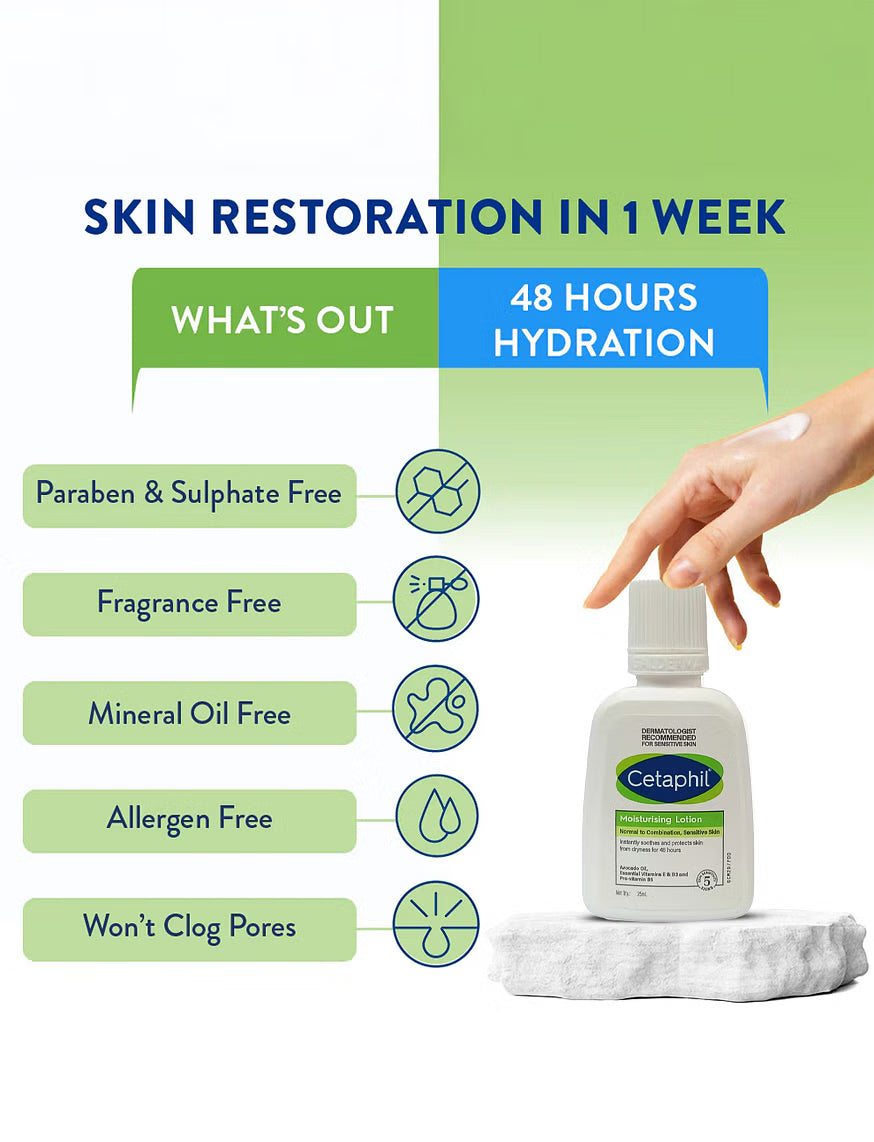 Cetaphil Moisturizing Lotion is an everyday moisturiser for long-lasting moisturisation. This fast-acting, lightweight moisturizer leaves skin smooth, soft and soothed, without a greasy feeling. The formula is designed to retain the skin’s natural moisture barrier. Cetaphil Moisturizing Lotion is formulated with powerful natural ingredients such as macadamia nut oil and glycerin which locks in skin moisture and protects the skin. The mild, non-irritating formula of Cetaphil Moisturizing Lotion is also non-comedogenic and fragrance-free. Daily hydration with a moisturiser should include the skin of the whole body, not just the face. Moisturising creams & lotions help to both rehydrate and prevent moisture loss, helping skin maintain its natural protective barrier and tolerance to irritation to look visibly healthy.