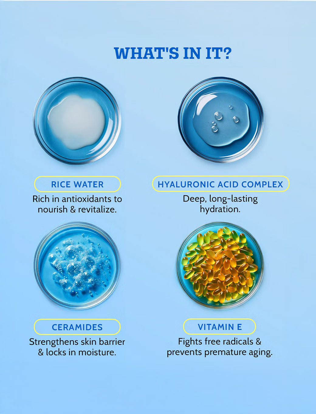 Hyaluronic Acid Complex, Vitamin E, Rice Water, Ceramides