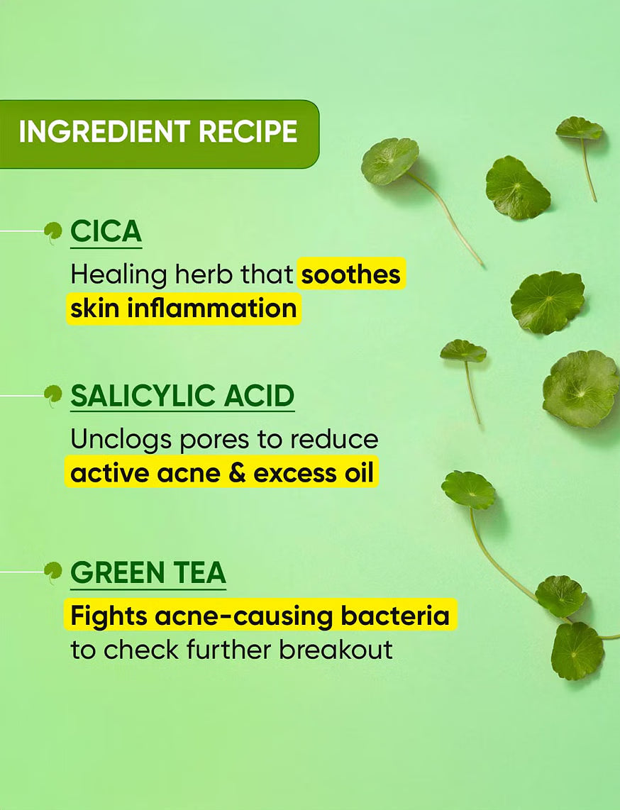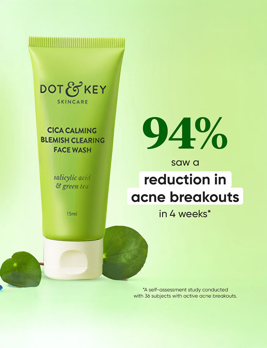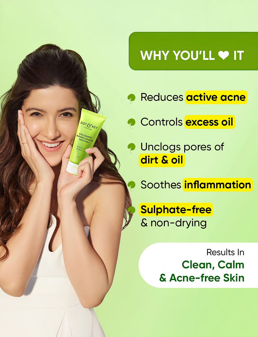 Dot & Key’s Cica Calming Blemish Clearing Face Wash is a gentle daily wash infused with the green goodness of Cica & Green Tea with the potency of Salicylic Acid & Zinc to help minimize acne and acne breakouts. This sulphate-free cleansing gel clears away oil, dirt and impurities without stripping away natural moisture, leaving the skin clean, oil-free & fresh.