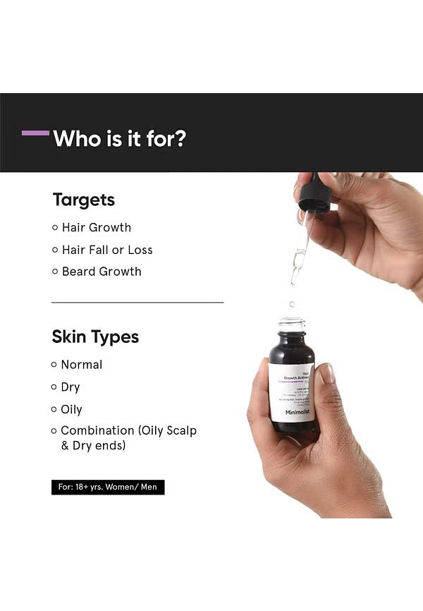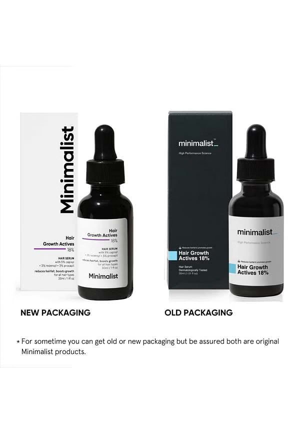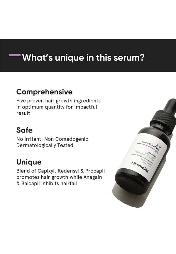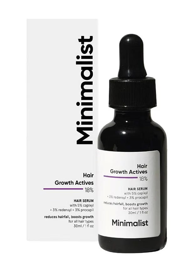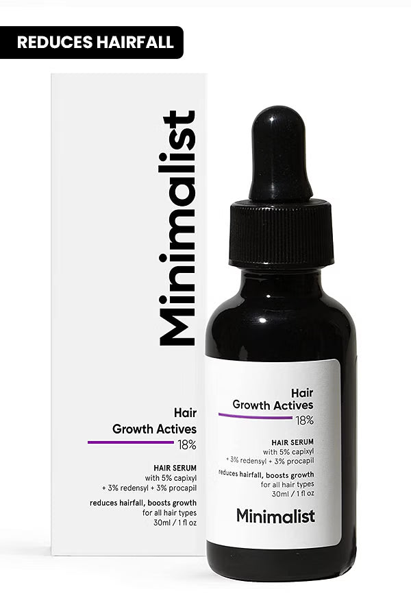 Achieve fuller, thicker hair with Minimalist Hair Growth Actives 18% Serum. This potent blend of 5 clinically proven ingredients—Capixyl, Redensyl, Procapil, Anagain, and Baicapil—at an 18% concentration targets hair thinning, reducing hair fall in 4-6 weeks and stimulating new growth in 8-12 weeks. Gentle enough for daily use, this fragrance-free, silicone-free serum delivers visible results without harsh side effects.