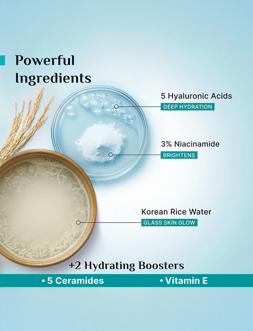 Water, Glycerin, Pentylene Glycol, Niacinamide, Oryza Sativa (Rice) Extract, Sodium Hyaluronate, Hyaluronic Acid, Ceramides, Morus Alba Extract, Laminaria Digitata Extract, (Full ingredient list may vary slightly)